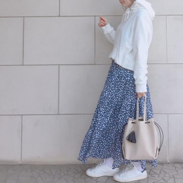 春感をアップしてくれる花柄。パーカを合わせてカジュアルなコーディネートに。他のアイテムのカラーは、ホワイト〜アイボリーにすることで、スカートを主役にした着こなしが完成します。