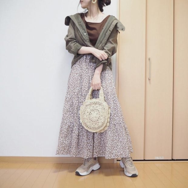 ベージュカラーの花柄スカートは、アースカラーでまとめることで、大人っぽいスタイリングに。落ち着いた色合いでまとめたコーデは、肌見せをしてヌケ感を出すとワンランク上の着こなしになりますよ。