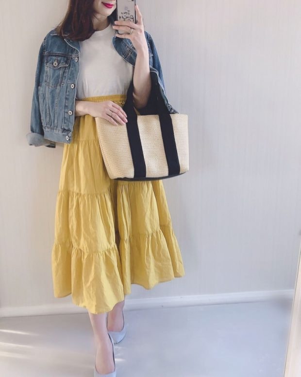 コーデ全体が明るい印象になるイエローのスカートは、春アウターとして活躍してくれるデニムジャケットと相性が◎。足元は無難なカラーにするのではなく、シルバーを持ってくることで洗練されたスタイリングを楽しめます。
