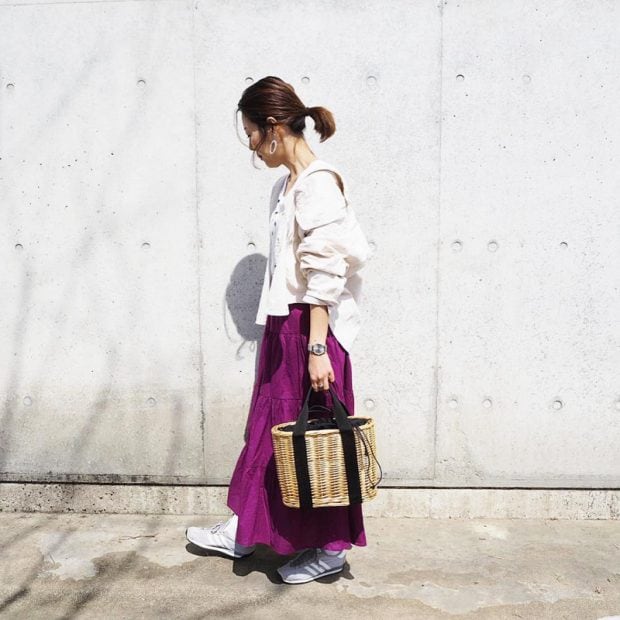 パープルのスカートを主役にして、華やかなスタイリングに。かごバッグを持って春仕様にすれば、ピクニックにもぴったりのコーデに。