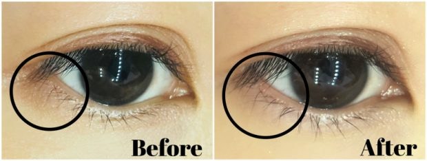 ▲(左)アイラインとアイシャドウを普通に塗った状態 (右)5回ほどメイク直しペンで中心部分をなぞって馴染ませた状態