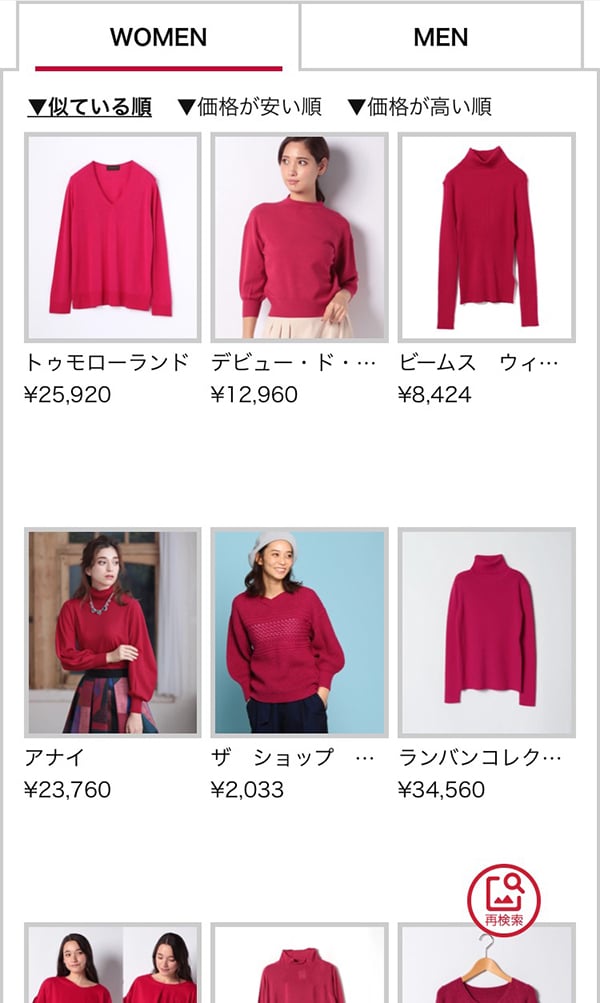しかも、「似ている順」「価格が安い順」「価格が高い順」で商品を並び変えたり、性別を切り替えたりするのもワンタップでOK。もちろん、お気に入りを発見したならそのまま購入もできるので、いろんなオンラインショップを見比べることなく、好みの一着をみつけられるというワケ。