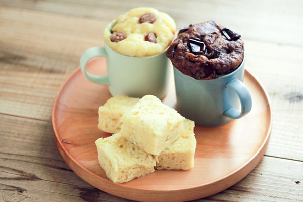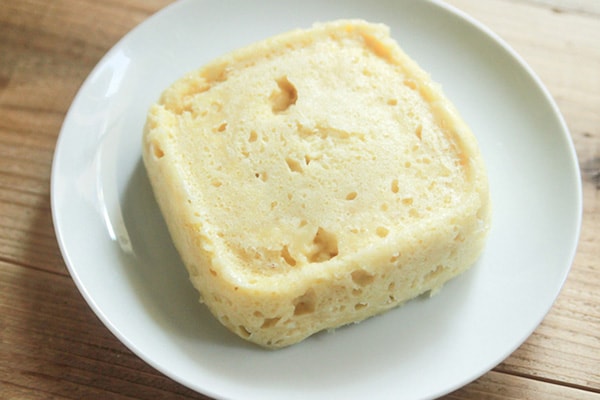 アレンジメニューとして、『ホットケーキミックス:80g、豆腐80g』でミニサイズも作ってみました。マグカップに材料を入れ、ぐるぐる混ぜてレンチンするだけ。