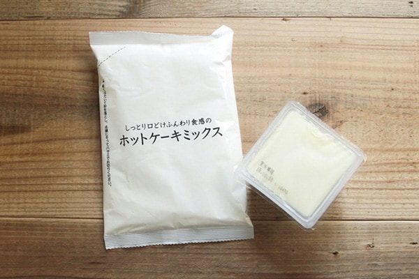 材料は「ホットケーキミックス」と「絹ごし豆腐」だけ。分量はそれぞれ同じ重さでOKなので、覚えやすいですね。今回はホットケーキミックス150g、豆腐150gで作ってみましょう。
