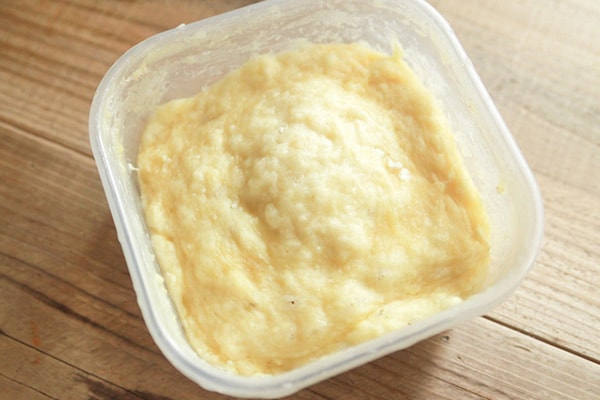 ②少し隙間を空けてフタやラップをかぶせ、600Wの電子レンジで4分加熱する。粗熱がとれたらタッパーから外してできあがり。