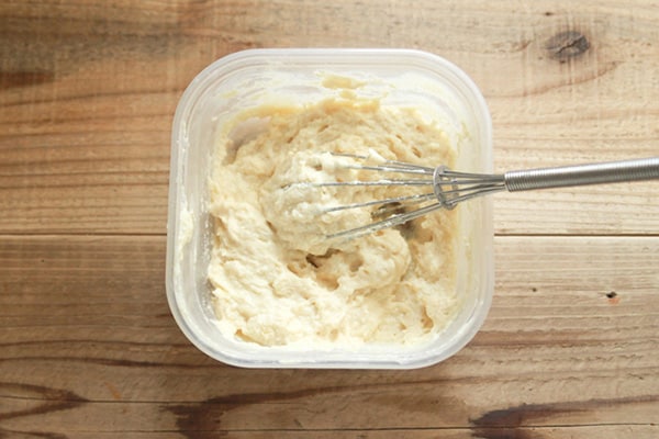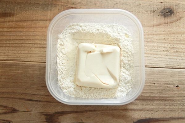 ①タッパーなどの耐熱容器にホットケーキミックス、絹ごし豆腐を入れ、なめらかになるまでよく混ぜる。