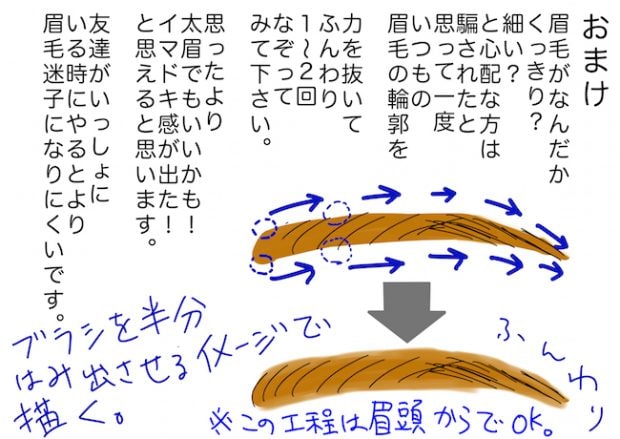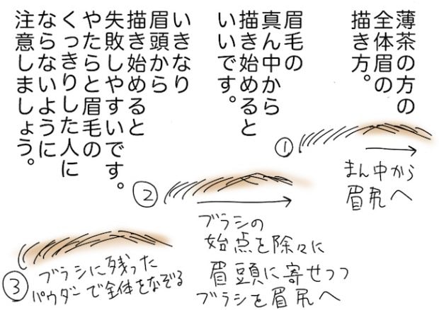 濃いめの色でまばらなところを描き足したら薄茶色で全体を描きますが、眉頭から描かないように注意! くっきりしすぎて「太眉」ではなく「ごんぶと眉」に見えてしまう恐れが……。