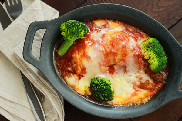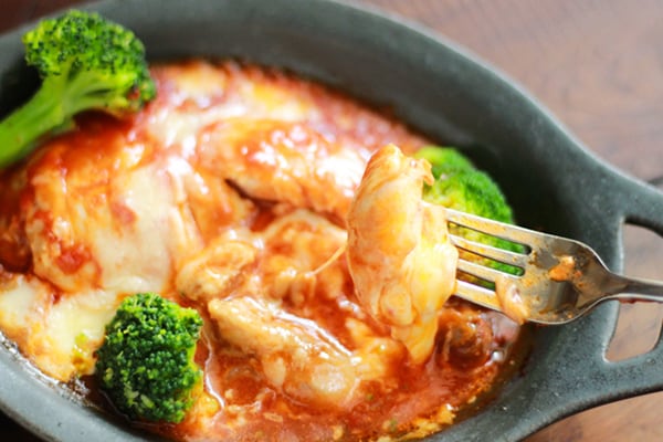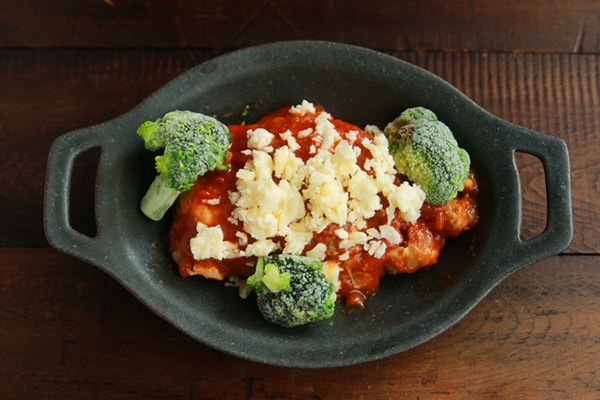 今回はチキンのチーズ焼きにアレンジしてみましょう。作り方は、チキンのトマト煮に冷凍ブロッコリーととろけるチーズをのせて、オーブンやトースターで温めるだけ!