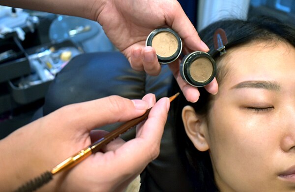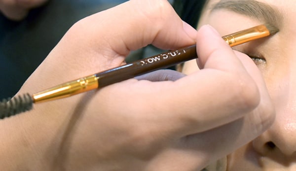 眉毛の中央から眉尻までは濃い色を乗せ、眉頭には薄い色を乗せます。仕上げにスクリューで眉全体をボカして、パウダーをなじませます。