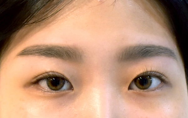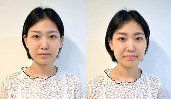 眉毛メイク前(写真左)、黄金比率のアート眉メイク後(写真右)