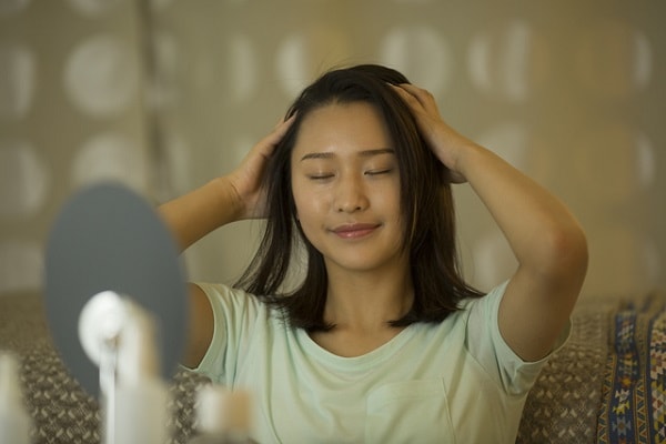 育毛剤は、女性用のもので頭皮や髪に優しいタイプのものを選びましょう。週末など余裕があるときだけでもOKなので、頭に育毛剤をプッシュしたら、頭皮全体を指のはらで優しくマッサージしてあげましょう。爪をたてると頭皮を傷つけてしまうので、爪が長い女性は要注意。指のはらを使って生え際から頭頂部という流れで、頭の前・横・うしろ(首筋)と順番に優しくマッサージをして血流アップを目指しましょう。