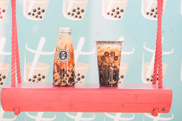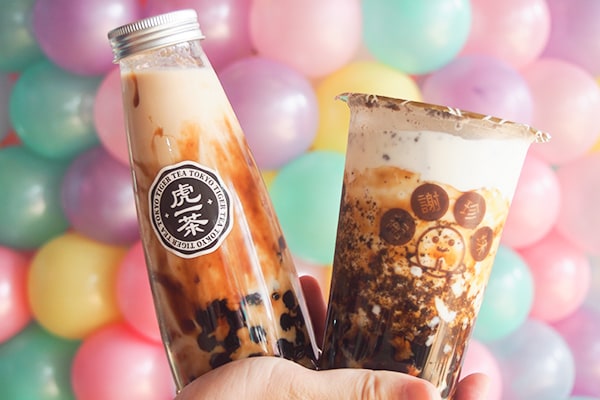 今回は、カップ(?)が特徴的な「虎一茶」の黒糖タピオカミルクティーと、「謝謝珍珠」のタピオカランド限定メニューである極黒糖オレオ牛乳をゲット! せっかく“映えスポット”風な背景がたくさんあるので、いくつかのパターンで撮影してみました。