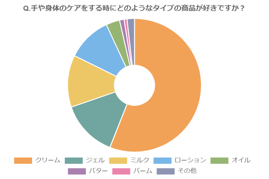 もっとも多かったのは、56%の「クリーム」。そもそも数が多い印象だし、使いやすい印象もありますね。2位の「ジェル」は13.7%なので、「クリーム」はダントツでした。