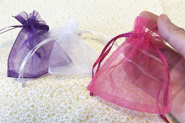 オーガンジーの巾着袋は、100均のギフト包装用品コーナーのほか、手芸店や雑貨店、ネットショップでもお手頃価格で入手可能。下の袋は、30枚600円で通販にて購入したものです。より安いものもあるので、好みのサイズ・カラーを探してみてください。