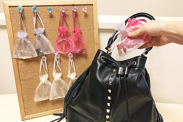 オーガンジー巾着袋が優秀なのは、ココから。よく身につけるアクセサリーは、袋をコルクボード+画鋲にかけて、ドレッサーやクローゼット付近に立てかけておきましょう。中身が透けて見えるので、時間のない朝だって今日必要なアクセサリーが一目瞭然。