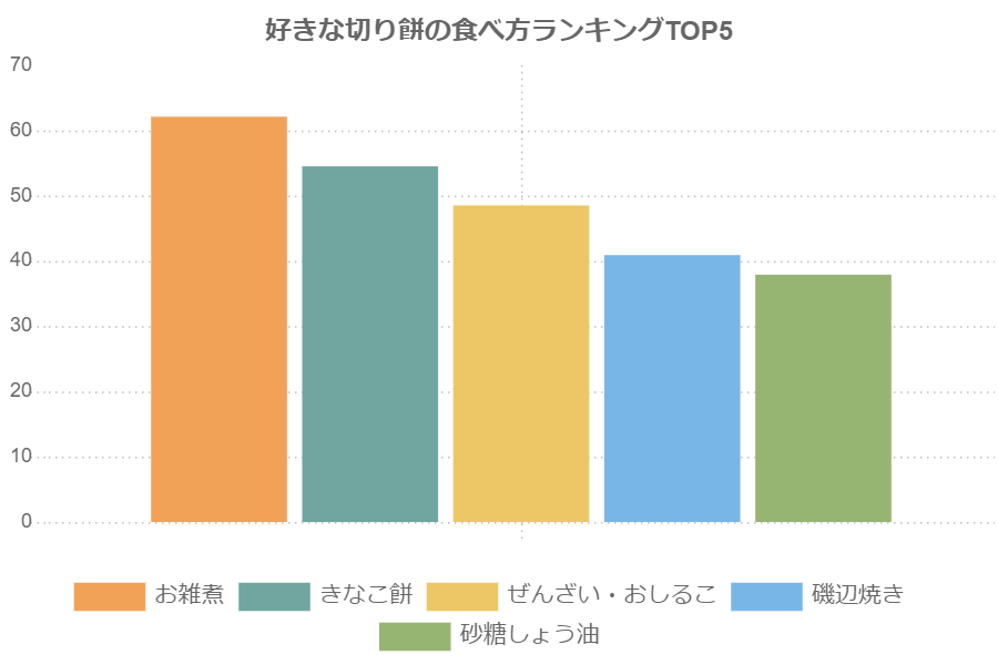 2位と3位に甘い食べ方がランクインする一方で、「からみ餅(大根おろし・しょう油などで味付けしたもの)」や「納豆餅」は下位になっています。もちもち食感のお餅は、甘い食べ方のほうがやや人気のようです。