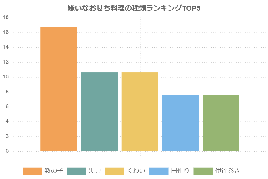 ちなみに今回の質問のなかで、「紅白かまぼこ」と「筑前煮」「えび」「鯛」は0票でした! どれもクセがない食べものだから、嫌いな人は少ないのかもしれませんね。