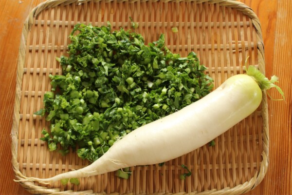 前掲したによると、葉の部分にはカロテンやカルシウム、鉄などのビタミンやミネラルが豊富とのこと。一方、普段食べている根の部分(一部は茎)には、消化器官のはたらきを助けるアミラーゼや、ガン予防の効果が期待できるオキシダーゼが含まれているそう。葉と根では異なる栄養素が含まれているため、両方とも無駄なく食べるのが望ましいようです。