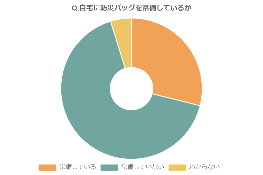「Q.常備している防災バッグの中身を定期的に点検したり入れ替えたりしているか」という問いには、「定期的にしている」と答えた人がわずか13.4%、「定期的ではないが気が付いた時にしている」と答えた人が61.6%いるものの、「点検や入れ替えはしていない」人も25%いて、4人に1人が準備しっぱなしになっているようです。