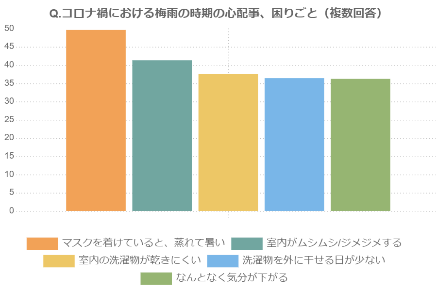 マーケディング・リサーチ会社のクロス・マーケティングが、全国の20~69歳の男女1100人を対象に行った「梅雨に関する調査」には、コロナ禍における梅雨の時期の悩みについての項目があります。選択肢は20ほどあるのですが、TOP5をピックアップして見ていきましょう。