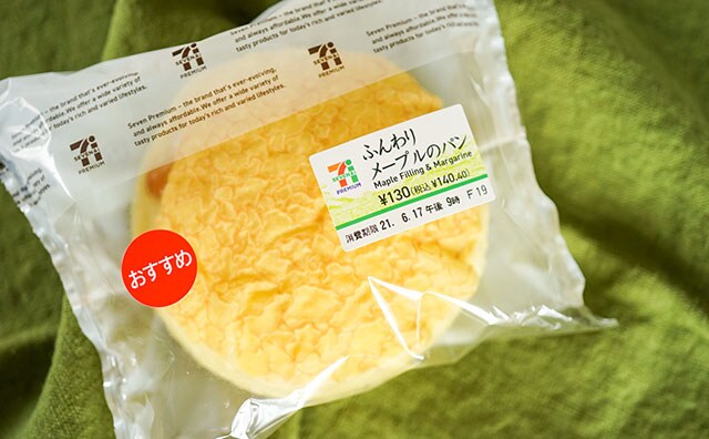 最後は「ふんわりメープルのパン」(税込140.40円)。クレープ皮を乗せて焼きあげたふんわり食感のパンに、メープルゼリーとマーガリンをサンドした菓子パンで、以前にも販売されていたことがある商品です。メープルのやさしい甘味とマーガリンのほのかな塩味が絶妙にマッチし、なんともいえないおいしさを楽しめます。