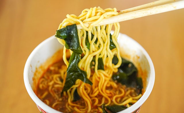 まずは、エースコックの人気カップ麺「わかめラーメン」の辛口バージョンである「タテロング わかめラーメン 辛口みそ」です。ポークをベースに魚醤や香味野菜のうまみを配合したみそスープはピリリとほどよい辛さがあって◎。食べごたえのあるたっぷりの“でかわかめ”も特徴のひとつですね。仕上げにかけるふりかけがおいしさのポイントになっています。
