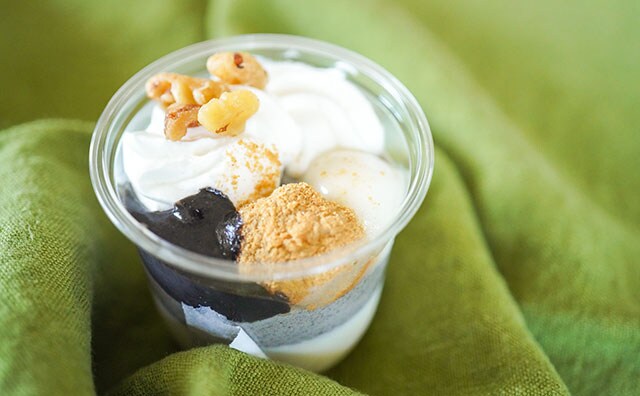 最後は8月18日(水)発売の「黒ごまと豆乳ブラマンジェパフェ」(税込300.24円)です。豆乳を使用したブラマンジェの上に、黒ごまムースを重ね、ホイップクリームと黒ごまタレ、白玉、くるみ、きな粉をまぶしたわらび餅をトッピングしたもの。豆乳と黒ごまの相性もよく、白玉やわらび餅などの食感も◎。いろんなおいしさを楽しめるのが同スイーツの魅力ですね。