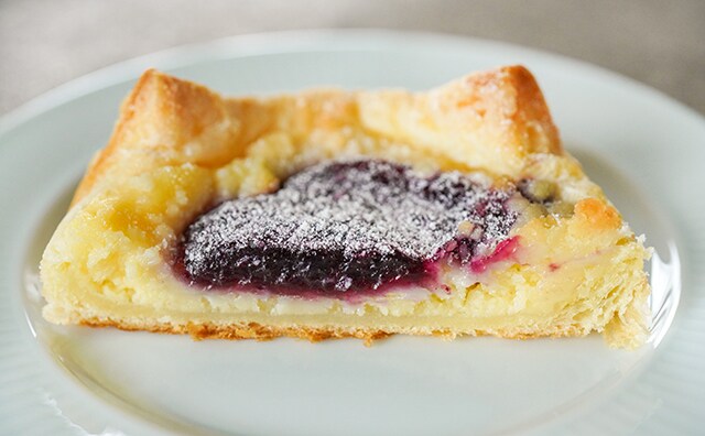最初にピックアップするのは2021年8月31日(火)に発売された「7P ブルーベリー&チーズクリームパイ」(税込149.04円)です。48層に重ねたパイ生地とチーズクリーム、ブルーベリージャムを組み合わせたもの。歯ざわりのよいパイ生地とフルーティーなブルーベリージャム、コクがあるチーズクリームの相性がよいですね。全体的に甘みの強い商品ですが、ブルーベリーの華やかな香りのおかげでくどさを感じることはありません。