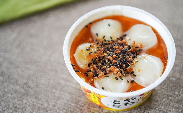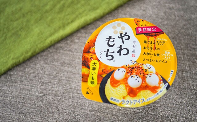 まずは井村屋の人気アイスシリーズ「やわもち」の新商品となる「やわもちアイス 大学いも味」(希望小売価格:税込151円)。秋の味覚であるさつまいもの和スイーツ「大学いも」をアイスに仕立てたもので、カップの中にはさつまいものアイスとおもち、黒ごま、キャンディチップ、本みりん・醤油・カラメルを使った蜜などが入っています。さつまいもの自然な甘みや香り、黒ごまの香ばしさ、カリッとした食感を楽しめるのがおいしさのポイントです。