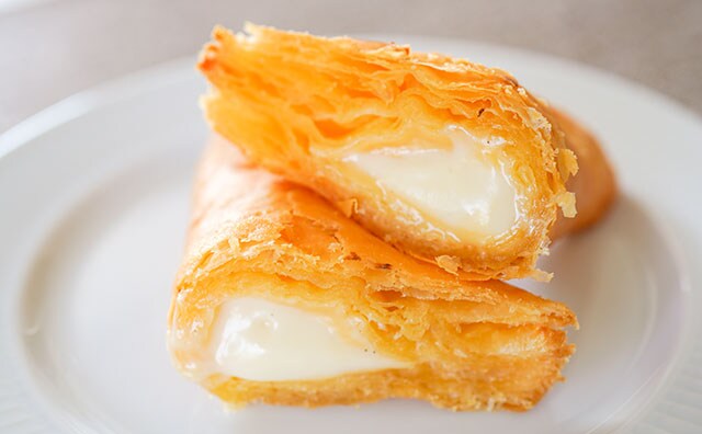 最後はマクドナルドが10月13日(水)に発売した「三角チョコパイ よくばりカスタード」(単品:税込150円)。マクドナルド秋冬の定番スイーツである「三角チョコパイ」の新商品はカスタードです。バニラビーンズが入った黄色いたまごカスタードと白いミルクカスタードの2種類を、ホワイトチョコを練り込んだパイ生地で包んでいます。サクサクのパイ生地と濃厚なカスタードは最高の組み合わせですね。販売期間は11月上旬までの予定。