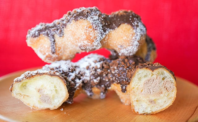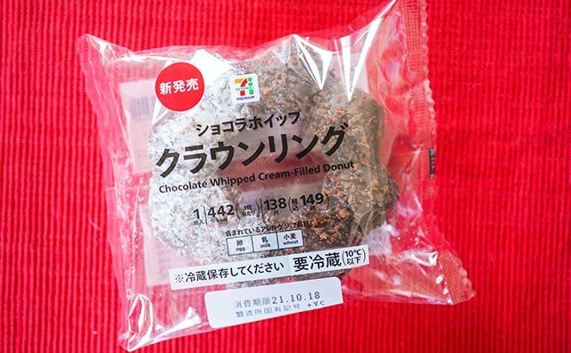 最初のスイーツは2021年10月14日(木)に発売された「7プレミアム クラウンリング ショコラホイップ」(税込149.04円)。一見するとただの「もちもちリング」の新商品に思える見ためですが、このドーナツはもちっと食感の生地の中にチョコホイップがたっぷりと入っています。さらに表面をミルクチョコでコーティングし、ザクザク食感のチョコクランチと粉糖もかかっているちょっとリッチな仕立てです。食感も楽しくてチョコの風味を堪能できる一品ですよ。