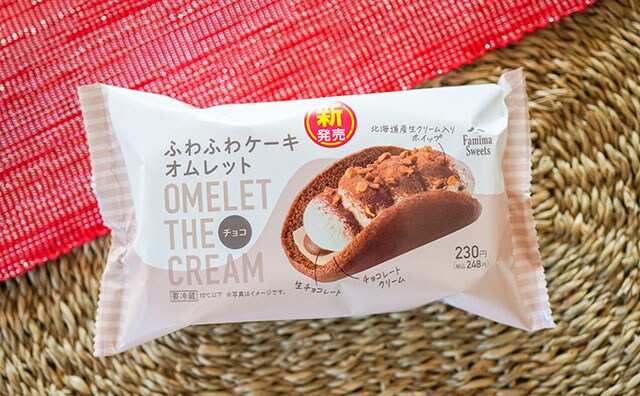 次の商品はファミリーマートが11月23日(火)に発売した「ふわふわケーキオムレット チョコ」(税込248円)。生チョコとチョコレートクリーム、北海道産生クリームをブレンドしたホイップクリームをオムレット生地で包み、さらにナッツとココアパウダーをトッピングしたスイーツです。すごく柔らかくてふわふわとした食感と、濃厚なチョコの風味、ミルキーなホイップクリーム、香ばしいナッツと、いろんな味わいが絶妙にマッチし、贅沢なおいしさに仕上がっています。