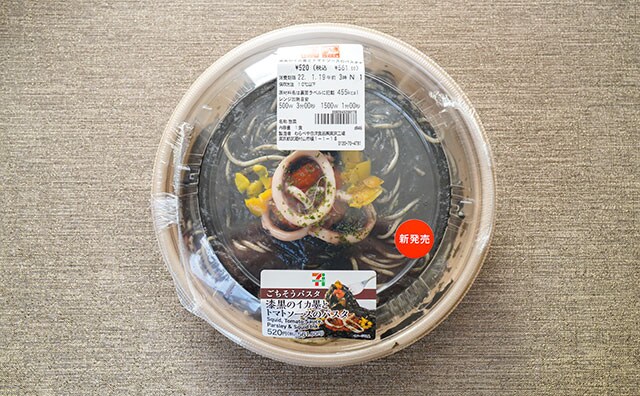 2品目は「漆黒のイカ墨とトマトソースのパスタ」(税込561.60円)。