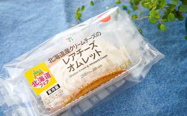 北海道フェアの商品として発売されたスイーツで、ふんわりしっとりとした食感のスポンジ生地に、チーズクリームとなめらかなチーズホイップを絞ってあるオムレットです。