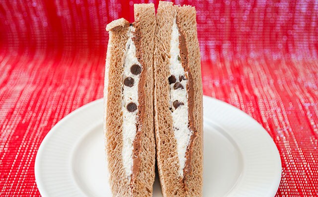ココア食パンとショコラムース、ホイップクリーム、チョコチップ、刻みアーモンド、ローストくるみを使ったスイーツサンドで、ふわふわのムース&クリームと、カリッコリッとした歯ざわりのチョコチップやナッツの香ばしさなどを味わえます。食感を楽しみたい方にはとくにおすすめできるスイーツですね。
