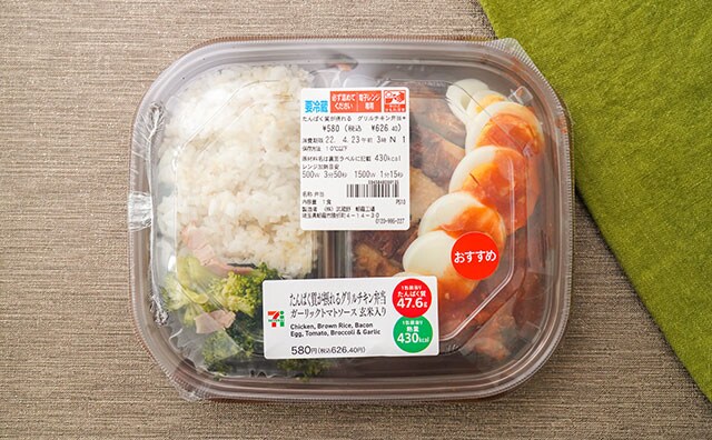 最後は4月19日(火)以降順次発売の「たんぱく質が摂れる グリルチキン弁当」(税込626.40円)。熱量430kcal、たんぱく質47.6g、脂質10.0g、糖質34.1g、食物繊維6.6gと、高たんぱく質のお弁当です。
