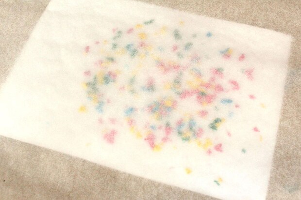 2. 1で乗せたクレヨンが散らばっていかないように優しくクッキングシートをかぶせます。