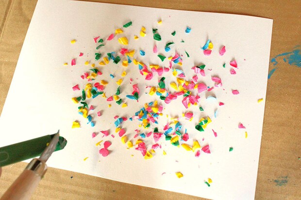 紙の上にクレヨンを小さく削っていきます。私は彫刻刀を使用しています。クレヨンの代わりにクーピーでも同様の作品ができます。クーピーであれば、専用の削り器を使って削りカスを落としていけばよいので、小さな子どもでも安心ですね。