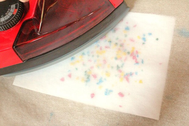 3. 上からそっとアイロンを当てます。低温、さらにほんの少しの時間であっという間に溶けていきます。長めにあてると、クレヨンがとろけるように混ざり合って、それもまた綺麗ですが、油染みができてしまいます。