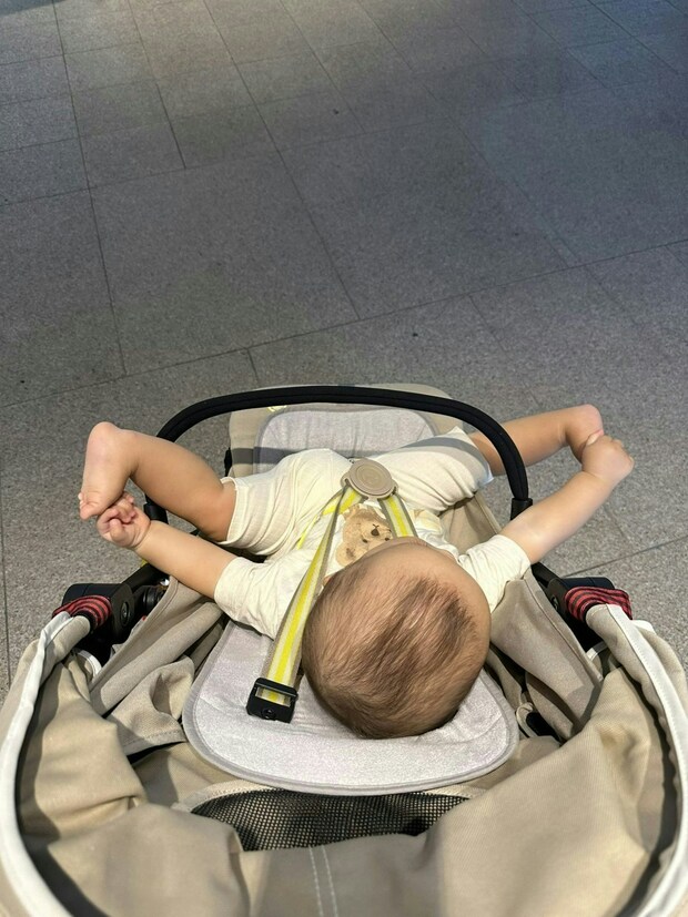 sao_nico☺︎0y🦕さんが投稿していたのは、ベビーカーに乗る息子さんの様子。手足をいっぱいに使い楽しそうですが、ママとしてはちょっと気になることがあったそう。