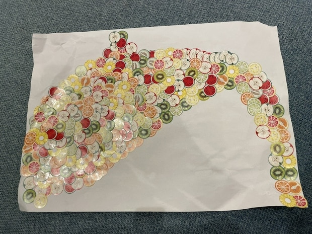 フルーツシールをたくさん使った大作。バナナは紙いっぱいに広がって、堂々としていて美しいですね。バナナを作るのにフルーツシールを使っているところもすてきです。この投稿には「おぉ、美しい」「色合いも含めてきれい!」「シールが全てフルーツなとこも含めてかわいい芸術家」といったリプライがついていました。