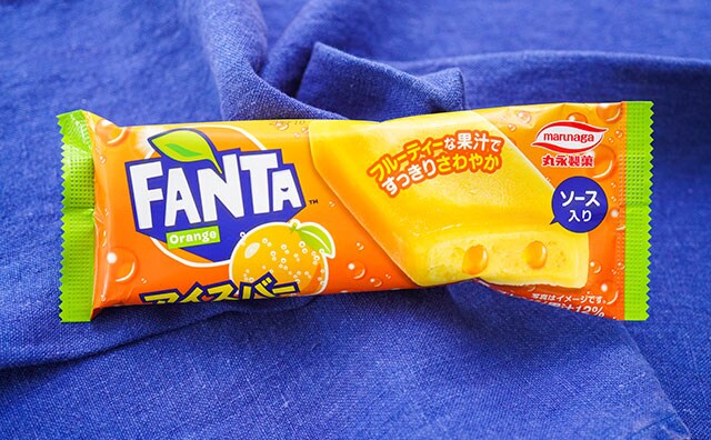人気炭酸飲料の「ファンタ」のオレンジ味を再現した同商品は、オレンジアイスキャンディーの中に、微細氷入りのオレンジシャーベットが入った2重構造のアイスバーで、両端それぞれにはオレンジソースも入っています。