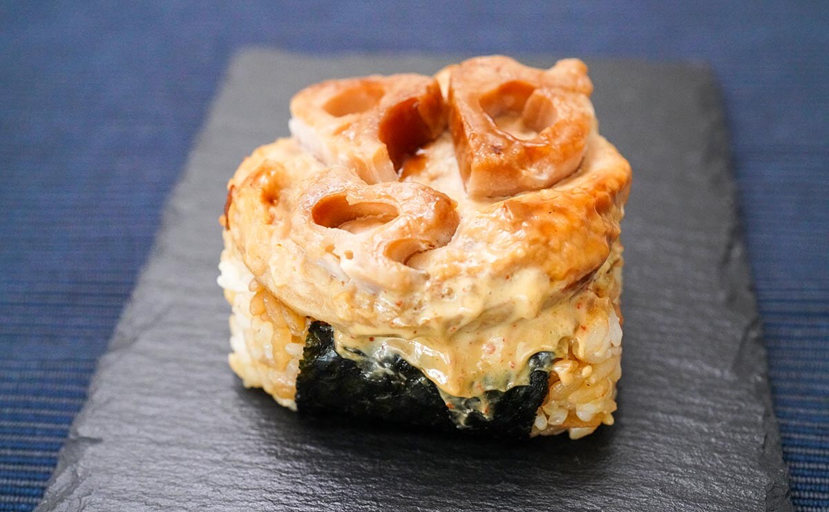 4品目は「つくね蓮根おむすび」。具だくさんなおむすびシリーズのひとつです。蓮根をトッピングして焼いた鶏つくねと、タレが染みこんだご飯を組み合わせたおむすびで、シャキシャキとした食感が特長になっています。