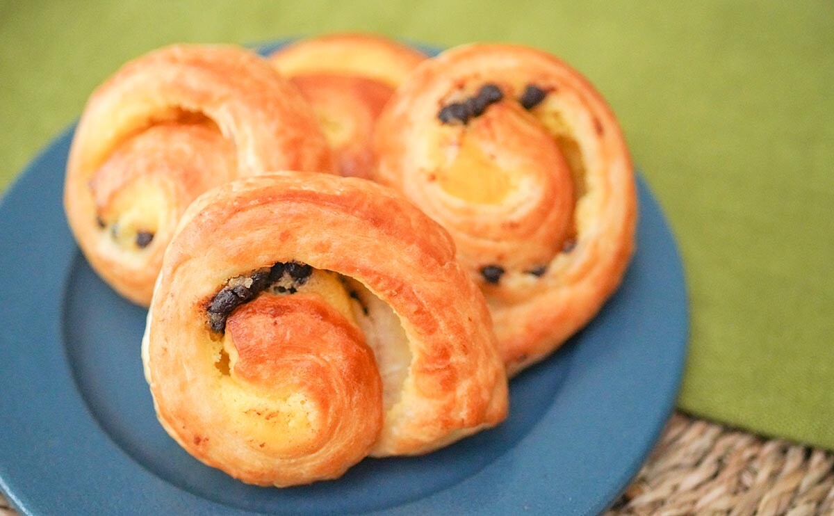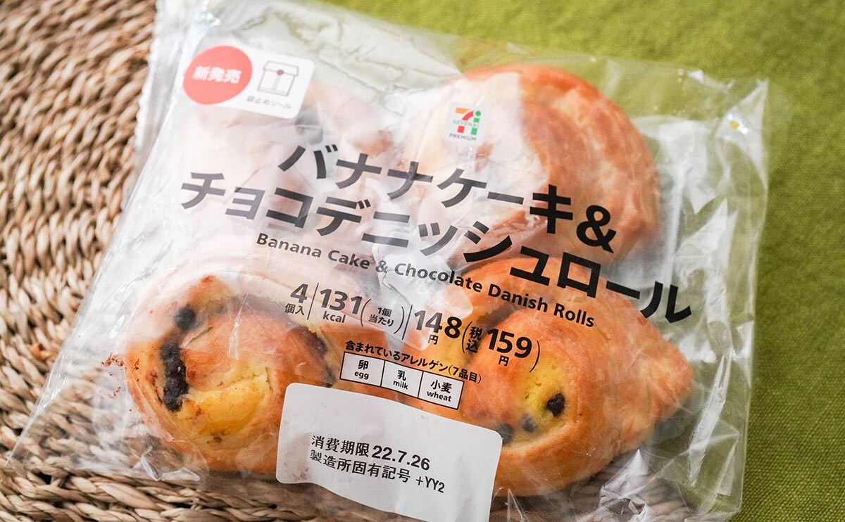 6品目は「7P バナナケーキ&チョコデニッシュ 4個入」。バナナケーキ生地とチョコチップをデニッシュ生地で巻きこんで焼きあげた菓子パンです。ふわっと香るバナナの風味とチョコの味わいは間違いない組み合わせですよね。