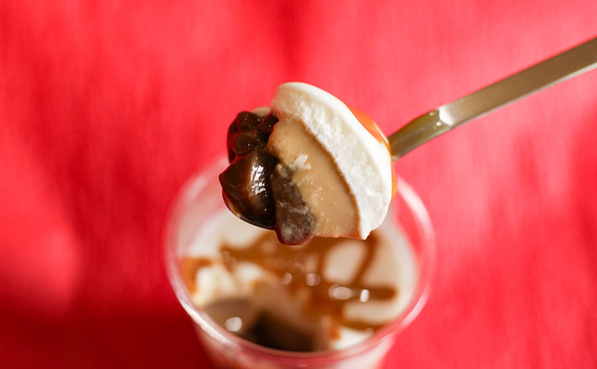 「まるでキャラメルラテみたいな珈琲ゼリー」は、その名のとおりキャラメルラテをスイーツで表現したもの。ふわっと軽いホイップ、まろやかな甘さ特長のキャラメルミルクプリン、ほろ苦い珈琲ゼリーをカップの中に閉じ込め、塩キャラメルソースがアクセントになっています。濃厚で、ミルキーで、甘くて、まさに“食べるキャラメルラテ”! 意外と食べごたえがあるのも、おすすめポイントですよ。