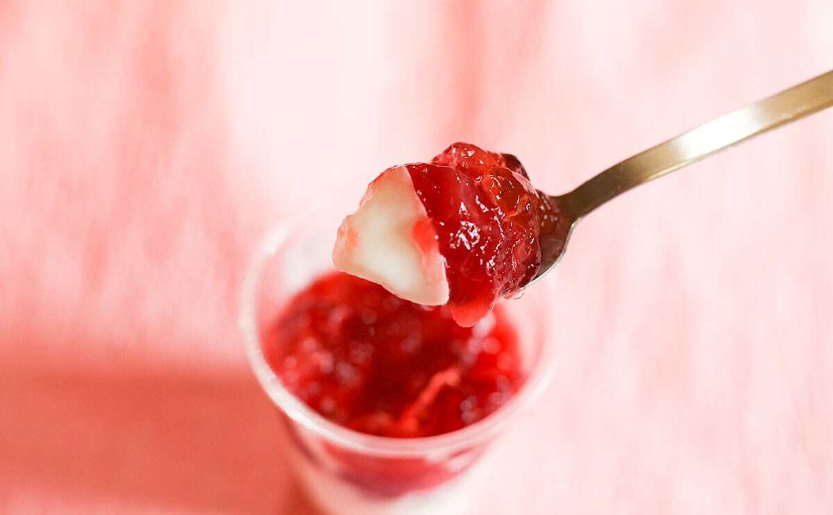 「まるで苺みたいないちご&杏仁」は、いちごのジュレや果肉と一緒に楽しむ杏仁豆腐。いちごのジュレは甘酸っぱくてさっぱりしていますが、ジャムのような強い甘さもあって、はじめは「想像していた味と違う……」という感じでした。が、杏仁豆腐がミルキーで濃厚だけど、どこかあっさりしているので、同時に食べるとナイスバランス!