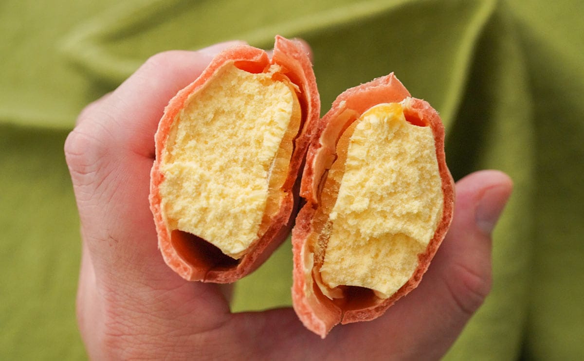 最中の中にはチョココーチングと、紅はるかペーストを使用したおいもアイスとおいもあんが入っています。おいもアイスは意外とあっさりとした味わいで、おいもあんは濃厚・濃密な芋の風味に仕上がっていますね。まろやかなチョコの甘みや最中の食感も加わって文句なしのおいしさです。