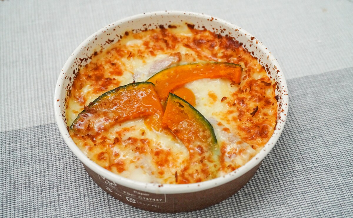 スライスされたかぼちゃがきれいにトッピングされたグラタンは、とってもクリーミー! なめらかで濃厚なかぼちゃの風味と甘みを楽しめるかぼちゃソースとホワイトソースの組み合わせは文句なしのおいしさです。さらに、ベーコンやチーズ、オニオン、ペンネなども使われているので、肉のうまみも楽しめるし、ボリューム感もばっちりの一品ですよ。