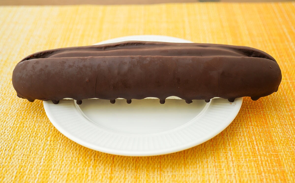 細長いパン生地のあいだいにホイップクリームを絞り、さらにその上からチョコをコーティングした商品です。