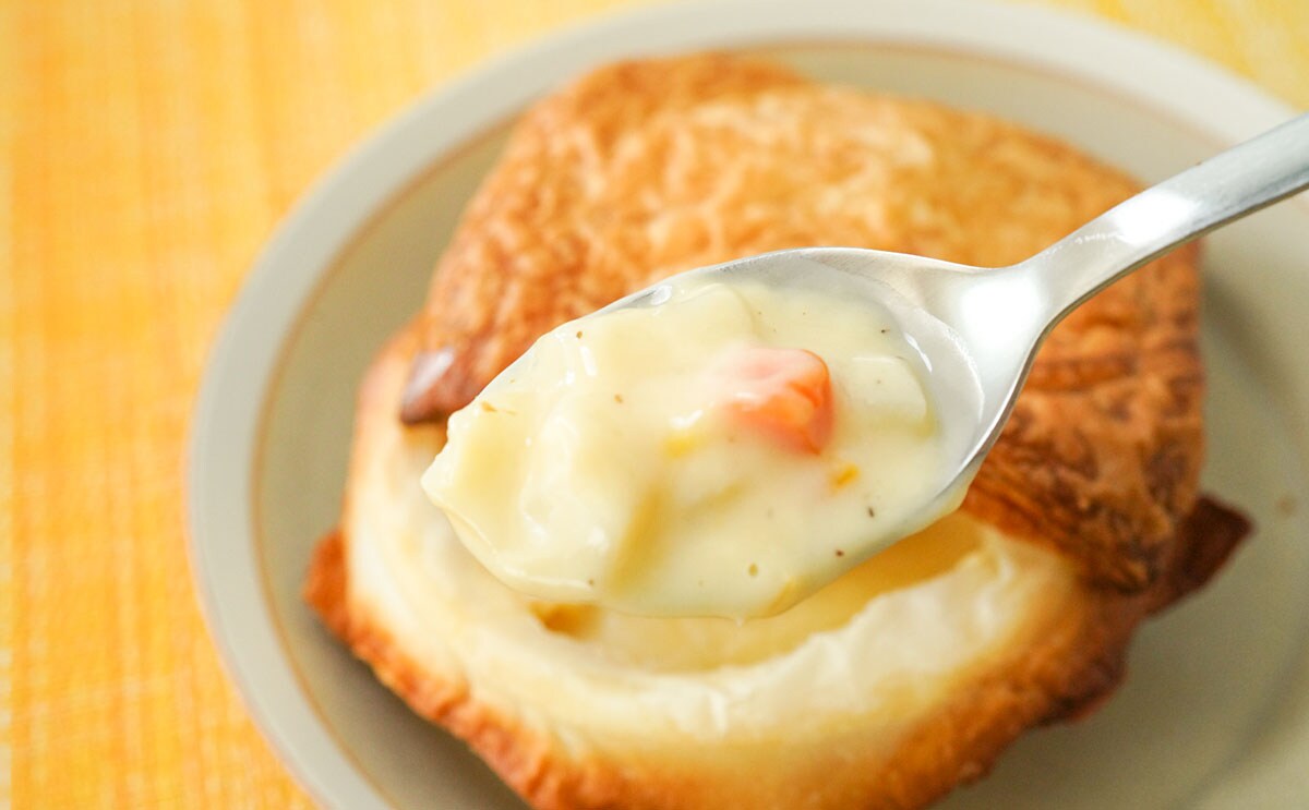 サクサクのパイ生地を崩してシチューにつけながら食べると、もう最高! 香ばしさやクリーミーさ、しっとりとしたチキン、野菜の甘みなど、安定のおいしさを楽しめます。